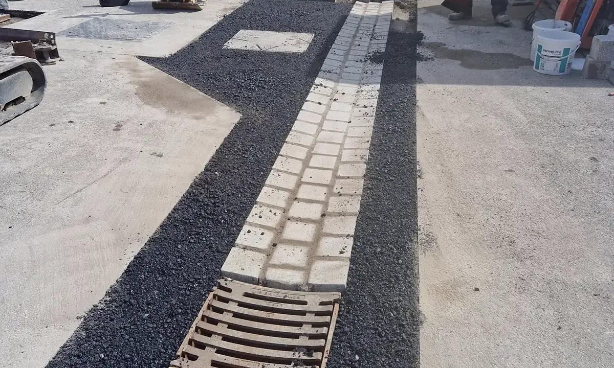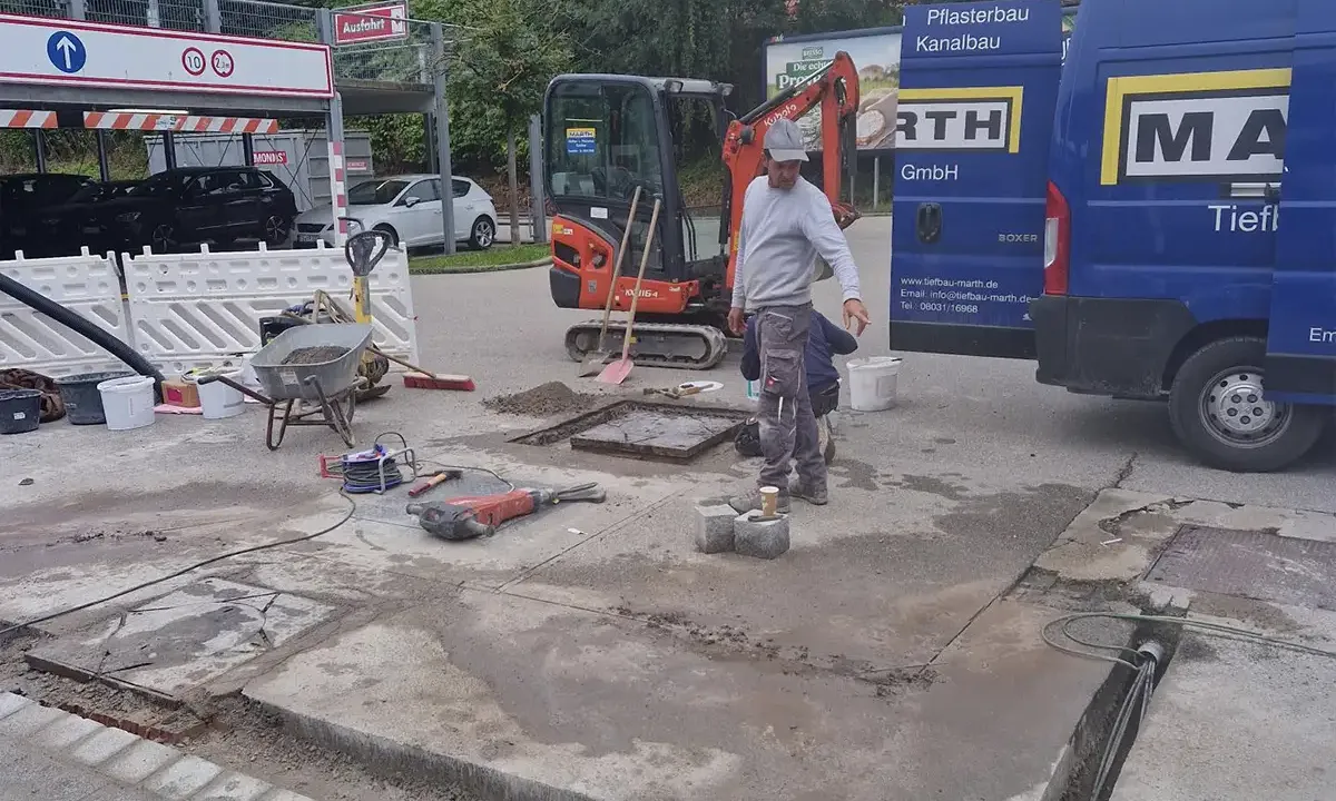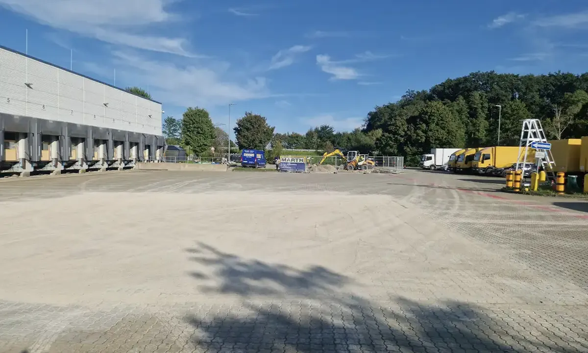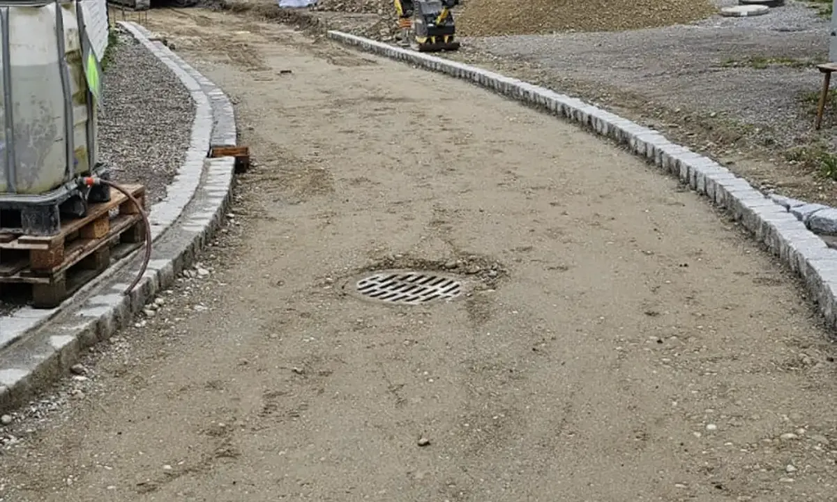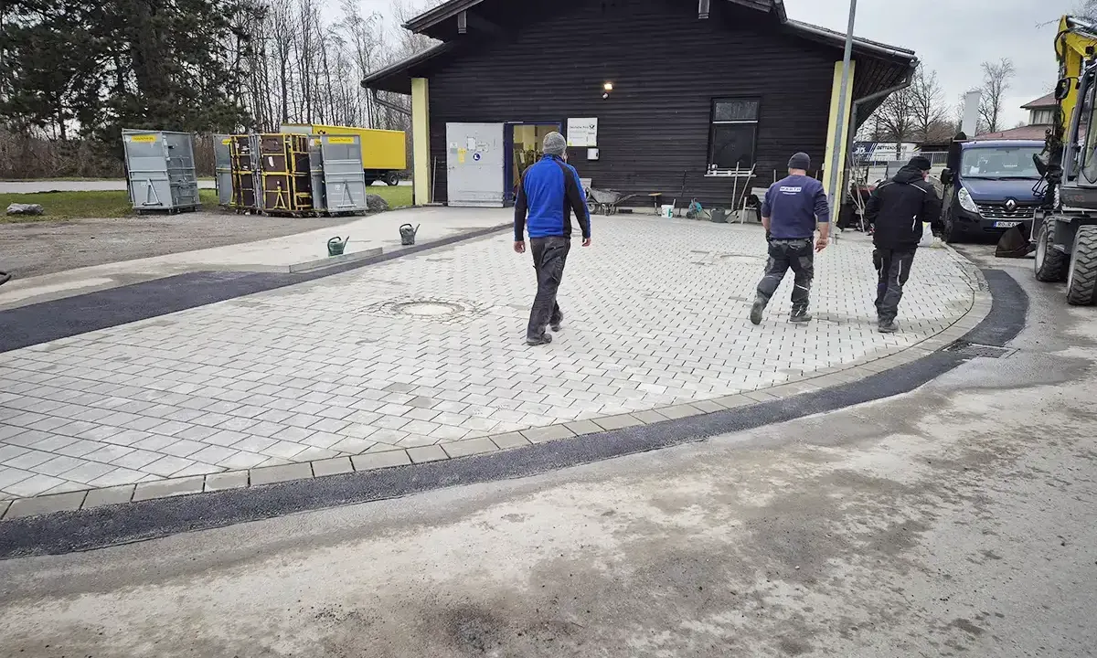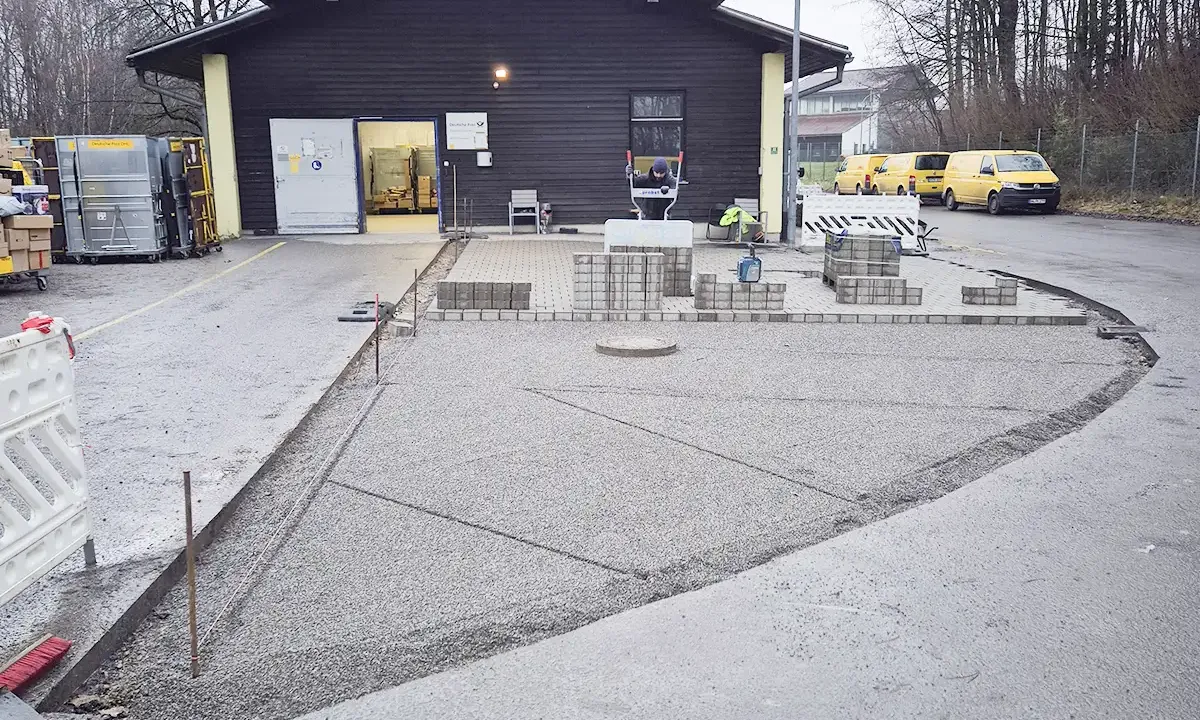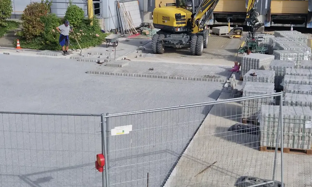 jahrelang Probleme mit der Pflasterfläche. Steine haben sich gelockert und dadurch kam es zu Sicherheitsrisiken und Hindernissen im Betrieb. Durch den Einbau von Rohrrigolen und Neuerstellung des Unterbaus mit Geotextil haben wir dieses Problem gelöst.